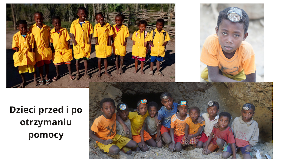 Każdego dnia maluszki w wieku 4, 5 lat wzwyż zamiast do szkoły idą do pracy do kopalni miki. Najczęściej bez śniadania – na ogarniętym klęską głodu południu Madagaskaru je się tylko kolację – ale i nie zawsze. Za 30 kg zebranej każdego dnia miki dzieci otrzymują 3 zł – to nie starcza nawet na butelkę mleka. Jeśli nie pójdą do pracy – po prostu umrą z głodu. I tak zdarza się im jeść popiół zmieszany z szarańczą, czy liście drzew.
